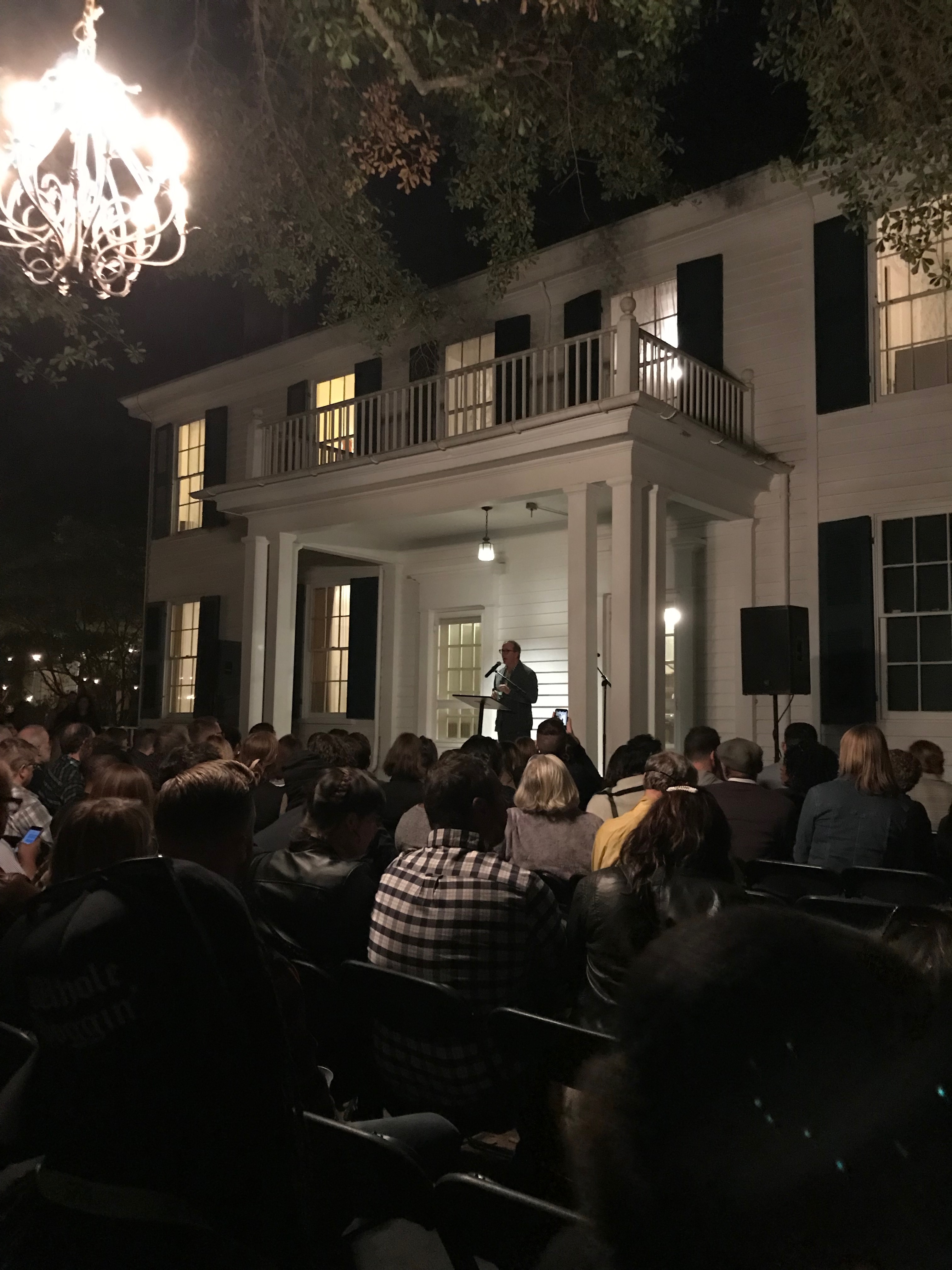 And now the pork. We’re back to the chitlins. At the table, to my left, was a chef who’d spent some time in Amory as a boy, and had been signing his cookbook that afternoon at Square Books. (I grabbed one the next day.) Directly across from me was a Hollywood writer/producer who grew up in Virginia. Next to him was the admissions director from my days at the Ole Alma Mater – I hadn’t seen him since. The Wife was to my right. Opinions varied, but it was Hollywood who was the most familiar and relaxed about them. Apparently he had eaten them relatively often in Virginia. The Wife said they weren’t as bad as she thought they’d be. I thought the texture was interesting, but the taste? Naw. (No reflection on chef. If I go to Seattle, I’ll be looking for another Chef Jordan meal.) I will add, should someone offer me a seriously crispy fried version somewhere down the line, I might try them again. Otherwise, with my one bite I have vigorously checked chitlins off the bucket list and am now firmly established in the post-chitlins era.
