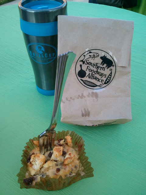Saturday traditionally begins early with an outdoor stand-up breakfast.  In past years we have enjoyed some sort of breakfast sandwich but this time Virginia Willis (author of Bon Appetit, Y’all) made individual breakfast casseroles.  Grits-based with cheese, sausage and something with a kick, it was a nice diversion made even more meaningful because we had eaten lunch with Virginia the day before, where she regaled us with stories from her time on Chopped and with tips from her new Okra cookbook.