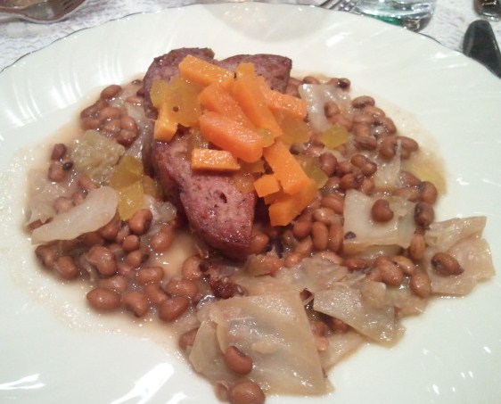 The main dish caused a bit of a stir, or at least triggered some intriguing conversation.  It wasn’t the Sea Island Red Peas and Cabbage, though those peas are not particularly easy to find.  Neither was it the sweet potato-watermelon rind relish, which was also quite unique.  The raised eyebrows and table murmurs resulted from the Tom Thumb Sausage.  According to the description we were given, a Tom Thumb is a hot sausage stuffed into a pig’s appendix.  (Everything but the squeal, right?)  I never quite got it straight if the casing was actually an appendix or not, but whatever it was, I ate every bite.