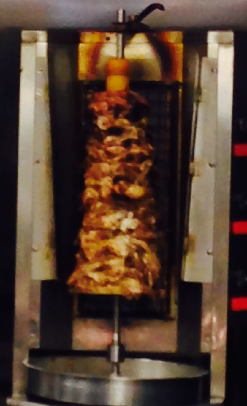 Now the shawarma. For those unfamiliar with the term, a shawarma is very similar to a gyro in form. The meat is on a vertical spit and cooked (or warmed) by a heat element on the back side of the spit. But while the gyro is usually beef and lamb, ground and formed on the spit and sliced into strips as it turns, shawarmas are often beef or chicken that is instead stacked into a tower of meat that is cut off in little chunks. We often joked about how many boneless chickens it took to make a full shawarma spit. A gyro is usually dressed with tzatziki sauce, lettuce and tomato, and wrapped in a thick pita, but a shawarma might have a garlic sauce, a variety of vegetable complements depending on regional tastes, and a thinner pita wrapped around it. In the “old country” we would buy them by the half dozen, request extra meat in lieu of the raw vegetables (because raw was a good way to get sick) and pay about a dollar a piece, even with double meat. The Mobile versions cost a little more, but were worth every cent. Not only that, it tasted like home, down to the slivers of pickles and French fries (aka chips) interspersed among the chicken.