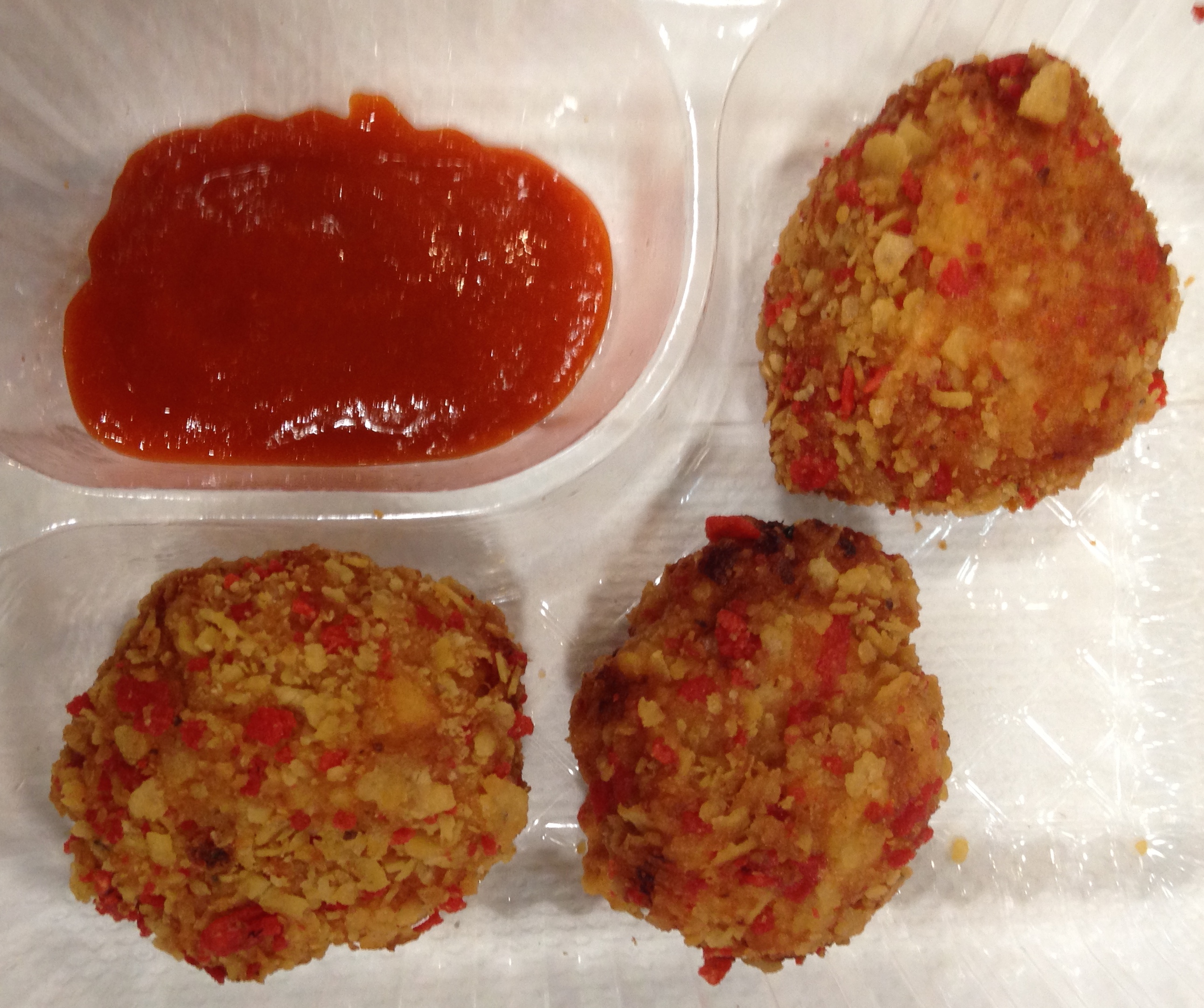 Speaking of winners, I should get you caught up on the other finalists. One was a chicken fried loaded baked potato. Sort of. It was indeed the insides of a baked potato with butter, bacon and cheddar, dipped in seasoned flour and fried. Around the corner were the Sriracha balls. I was a little nervous, what with my taste buds being tender (as we all know by now). But as hot sauces go, I do like the flavor of Sriracha. There was potential. This was a ball of shredded chicken, corn, green chilies and tomatoes- and of course, Sriracha – that had been rolled in crushed tortilla chips (a unique twist) and fried. Though they were a nudge higher on the spicy scale than I usually choose, I loved the concept.