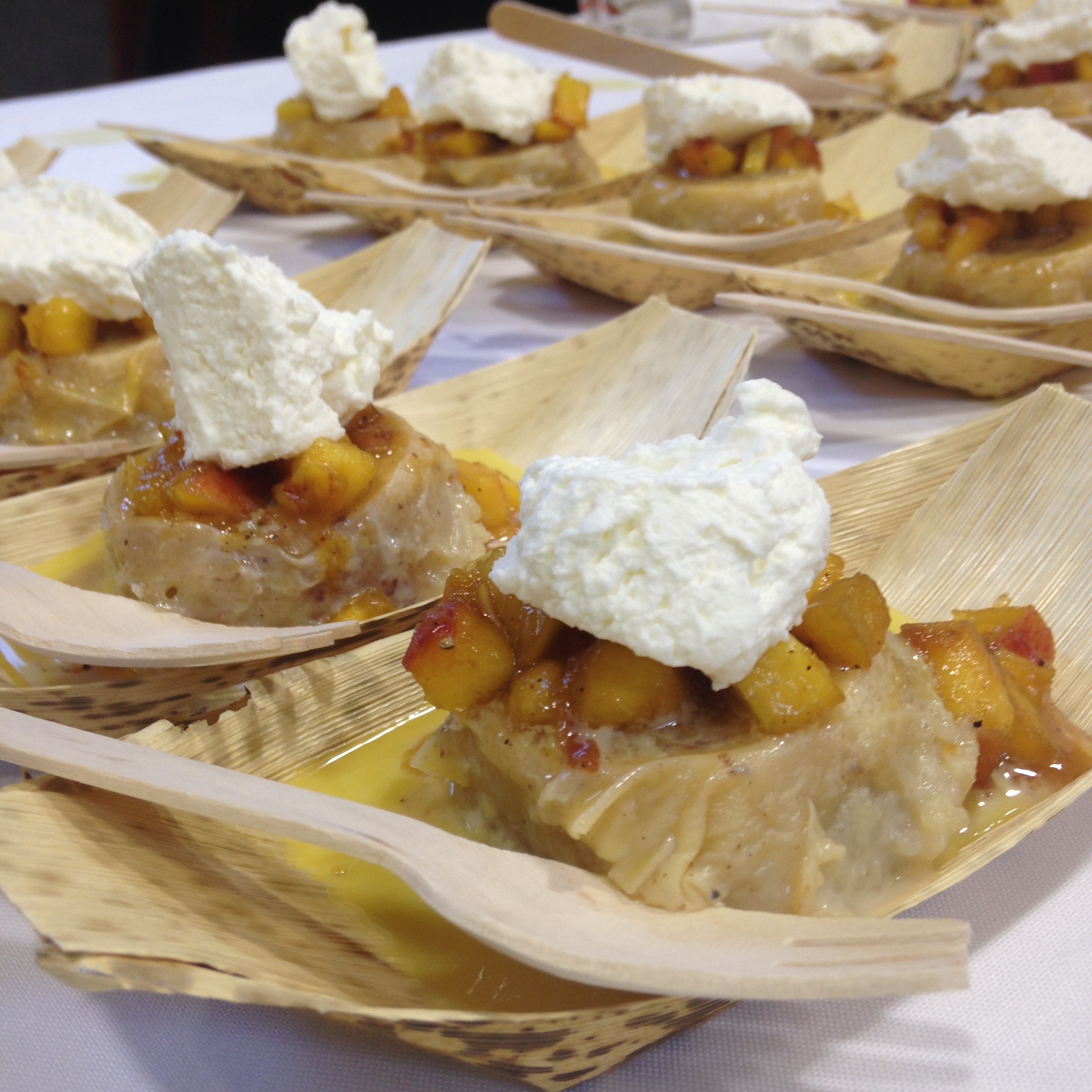 Felicia Suzanne Willet (Felicia Suzanne’s of Memphis) made Butter Rolls with Brandy Peaches and Whiskey Anglaise. At one of the pharmacies I’ve worked in, we had a regular customer who rarely visited without mentioning his desire for butter rolls. I continually encouraged him to bring some to me, and I’m still waiting. It’s unlikely his had Anglaise sauce drizzled on them, but I was thrilled to finally get one.
