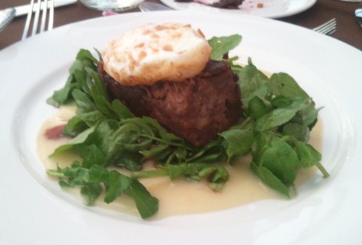 As one might imagine, Daughter left the trout untried. But the main course was more up her alley – mine, too. Chef Josh Feathers described it as Seared Braised and Pressed Ancient White Park Beef with Potato Foie Gras Puree and Watercress with Dried Cherries. When it arrived, the beef looked like a rectangular cut of steak or roast. When my fork hit it, it slowly fell apart into a pile of tender and tasty bites. A little dip into the rich puree and a stab of watercress and cherry, all on the same fork, was a very special mouthful.