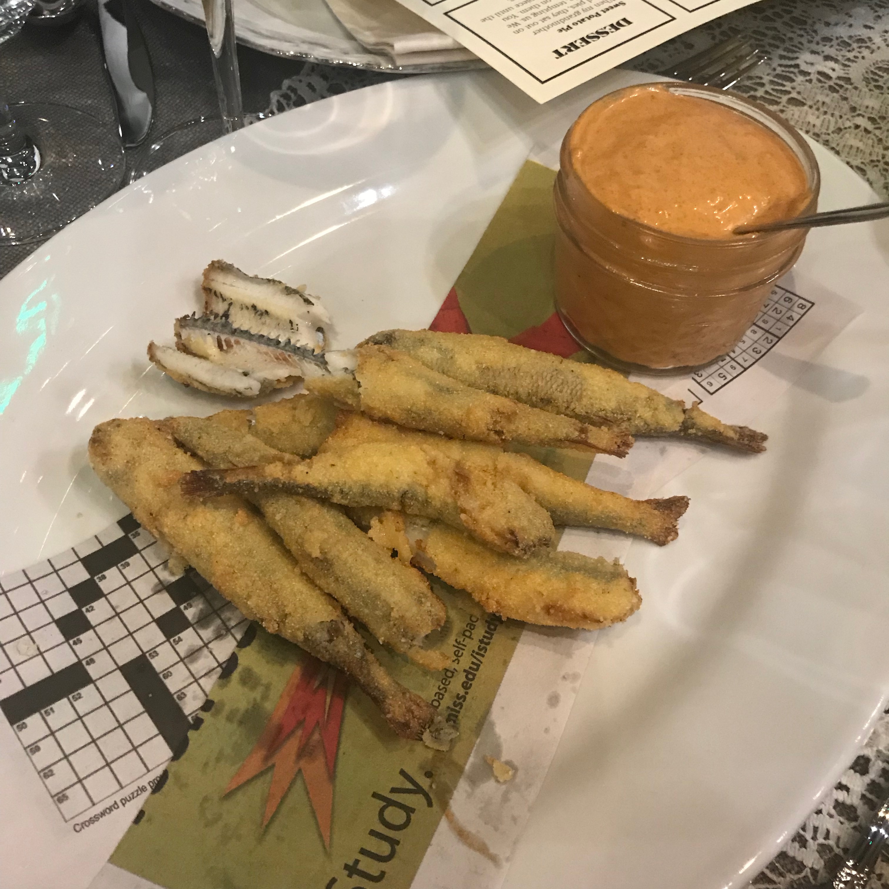 To begin, there were boiled peanuts, buttermilk biscuits with cane syrup, fried smelt, and pickled pigs feet. Not a lot of surprises here. Loved the biscuits, of course. I have learned to appreciate boiled peanuts. A friend seasoned his baked beans with pigs feet once. Many fried fish have met their end because of me, though these may have been the smallest I’ve eaten.