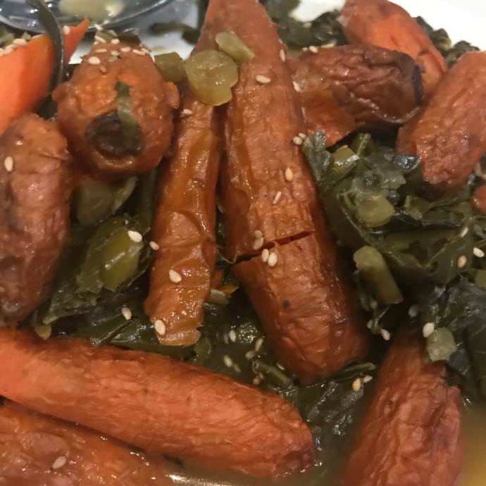 In the Vegetables and Grains portion of the menu, we had steamed okra with sorghum Tabasco chili vinaigrette, and thinking back, this may have been my first encounter with steamed okra – I’ve had it just about every other possible way. We also had peas, beans and grains salad with preserved lemon – I really liked this take. My favorite was the smoked carrots, collards and Anson Mills benne seeds. The smoked carrots really made it work.
