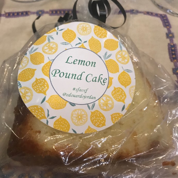 For dessert, a slice of sweet potato pie with a bit less sweet than I’m accustomed to, a bit more spice, and a ball of meringue on top. For the road, a “parting gift”: a slice of lemon pound cake from his grandmother’s recipe, subbing his creme fraiche for her sour cream.